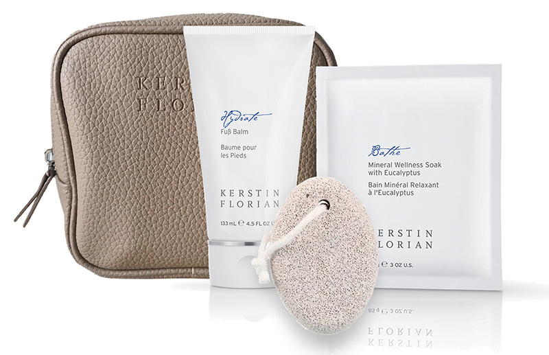Mjukgörande, uppfriskande fot- och kroppskräm, mineraliserande badsalt med härlig doft av eukalyptus och vacker i fotfil i pimpsten i en brun necessär.