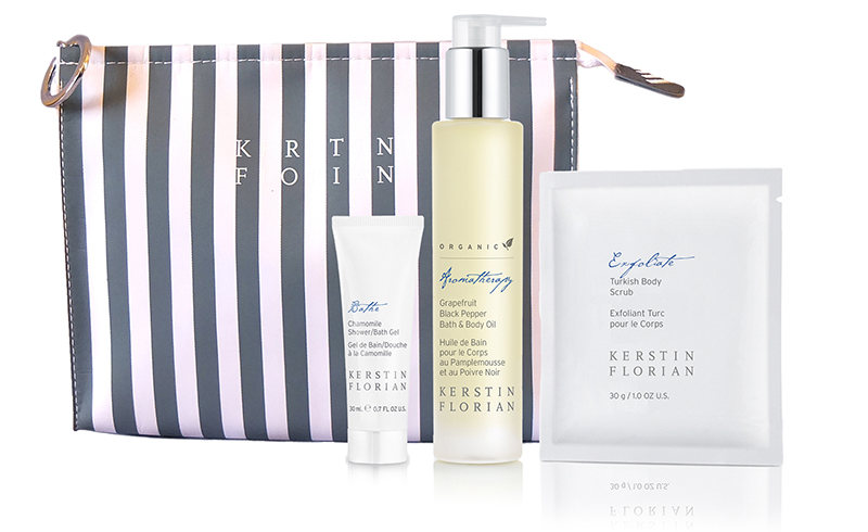 Ekologisk kroppsolja med naturlig detoxeffekt, krämig saltskrubb rik på mineraler och mild kroppsrengöring med härlig doft av ringblomma & kamomill i en grå/vit randig necessär.