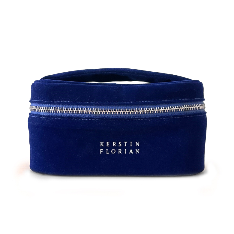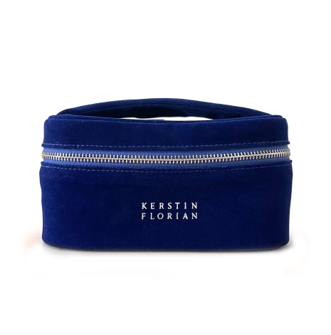 Toalettveske i blå fløyel og Kerstin Florian-logo i sølv. Begrenset opplag!