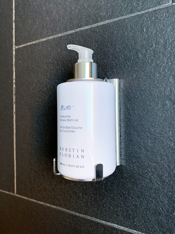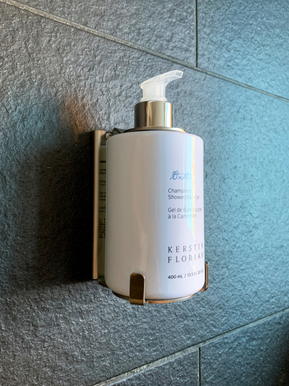 Enkelholder for dusj- og omkledningsrom, i rustfritt stål. Tilpasset designen på flaskene på 400 ml.